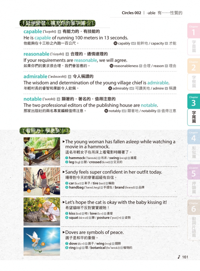 如何將同心圓發揮最大的效用呢?主題的選擇是非常重要的。全書分成六個章節,除了基本的「字首篇」、「字根篇」、「字尾篇」之外,更將一般學習者容易搞混的單字整理成「押韻篇」、「形似篇」,及需要熟悉才能夠靈活運用的「動詞片語篇」,清楚整理出英文單字中最精華的內容。