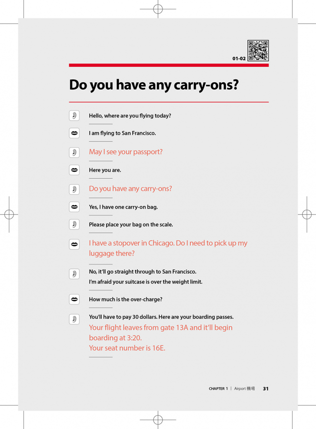 每一主題內都會再細分該主題中「一定會用得到的情境」,如在機場如何輕鬆辦理登機、市場內如何殺價,或是遇到不好的服務該如何客訴,各種應對進退的情境會話句,通通都讓你知道!