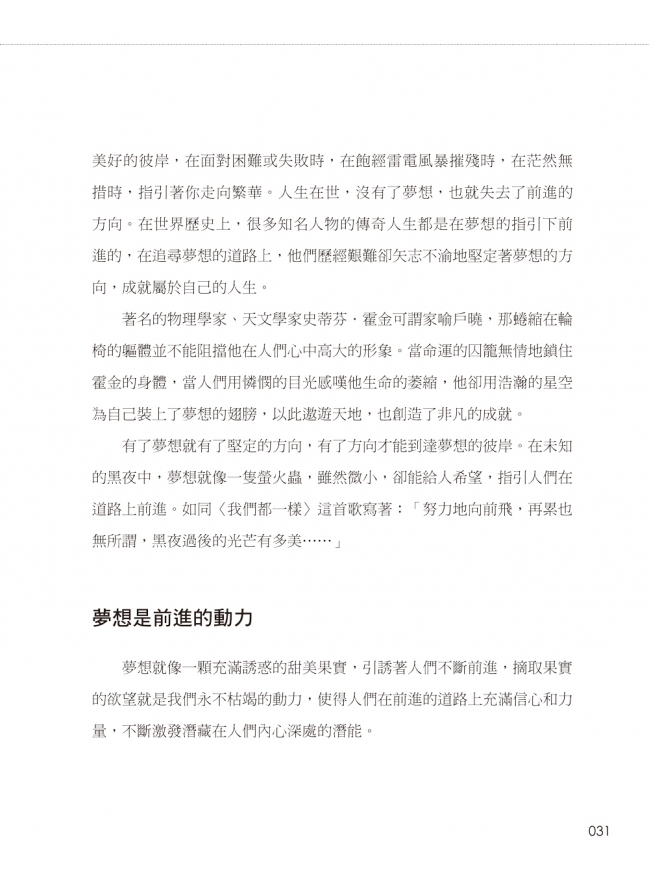 其實人生沒有夢想,並不會怎麼樣,還是一樣活著、一樣吃喝拉撒睡。只是沒有夢想的人,就像機器人一樣,364天之後的生活跟現在的生活一樣,只是身體老了點、動作慢了點而已。