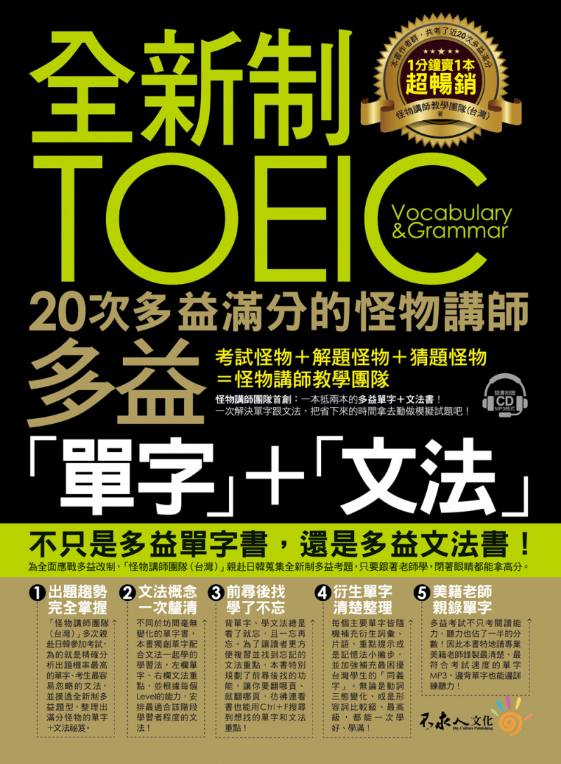 多益全面改制,不只考生,連講師們都不知所措!根據考試怪物多年的經驗發現,想在多益考試拿高分,「單字」和「文法」是最重要的兩個關鍵,只要掌握這兩個關鍵,你也能豪邁地踏進金色證書的殿堂,成為下一個考試怪物!