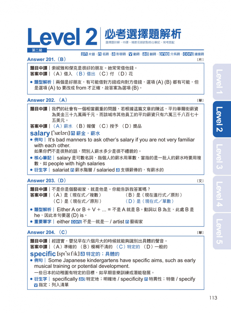 每個考題都明確標出其考點為「單字」、「文法」或「片語」,讓考生們能在檢討錯誤題目的同時,輕鬆分析出自己的弱點,並集中加強不擅長的內容,才能全方位、無死角為正式考試做準備。