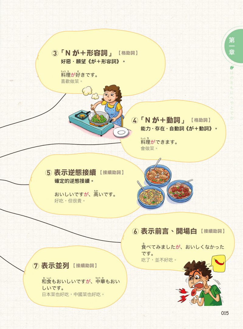 が、高い」的「が」則是表示逆接的接續助詞,這些在書裡都會介紹到,因此可以一次認識到「が」的各種用法。