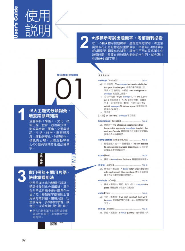 所有的單字以1至5顆星號標示重要性和出題機率,星號愈多表示愈單字重要、出題機率也愈大。而為了方便考生快速掌握單字,也以條列式的說明幫助考生記憶單字的詞性和簡明中文解釋,讀之一目瞭然。