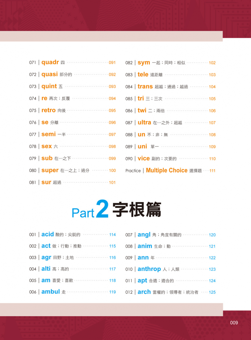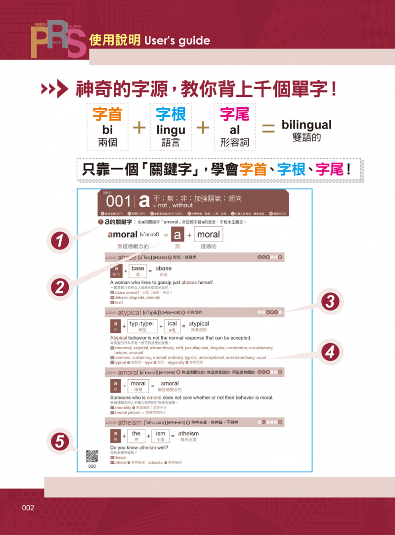 本書將每一個例字拆解出字首、字根、字尾,並且附上中文意思供讀者參考,引導讀者學以致用。下次碰到陌生的單字,也可以試著自己拆解字源,並且分析字義。提醒讀者部分字源可能會因為演變而呈現和單字無關的意思。