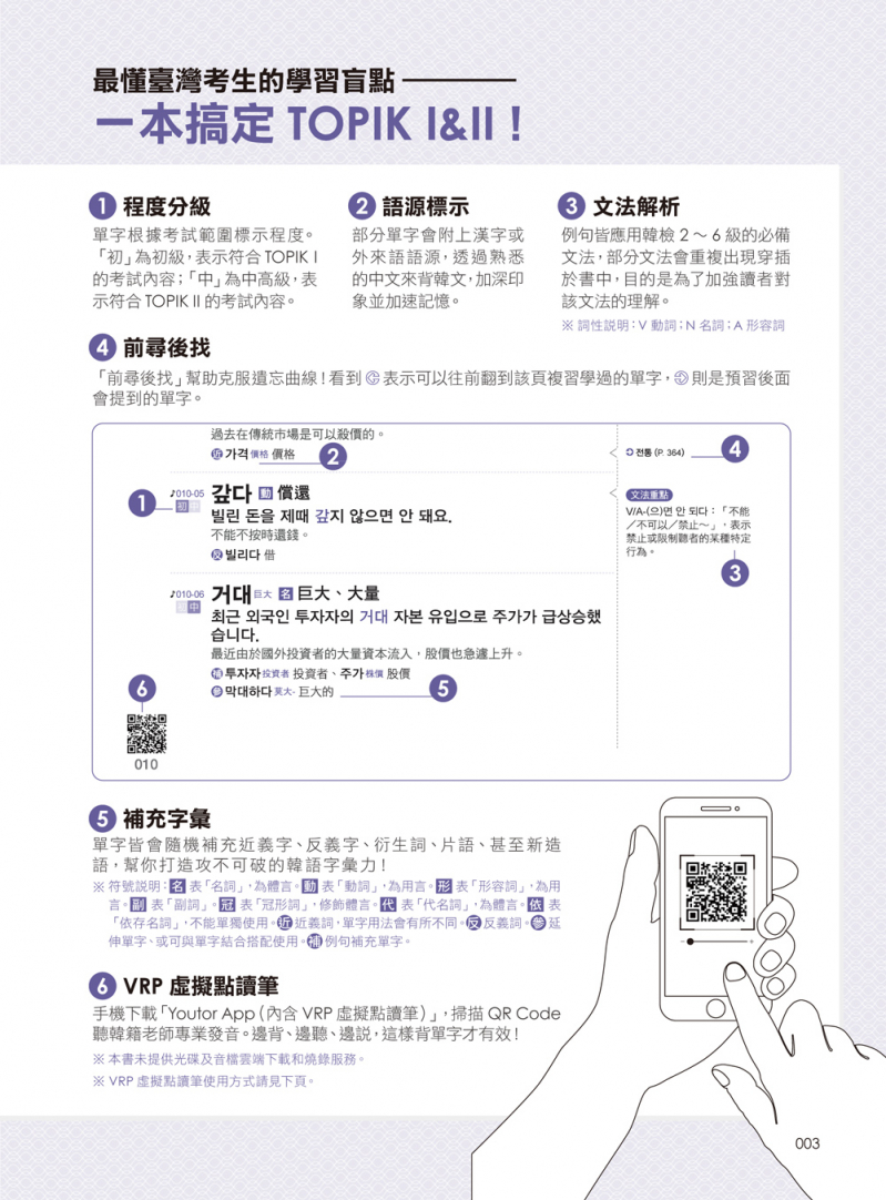 《NEW TOPIK I &II怪物講師教學團隊的新韓檢「單字」+「文法」》將TOPIK最常出現的單字分類並介紹給讀者,單字都搭配實際會用到的句型,為了讓讀者更容易掌握單字的意思,也標示了漢字或外來語語源。例句包含了說明文、報導資料、新聞等一些較枯燥乏味的書面體,也有實際在職場上、家庭、朋友之間會使用的口語體,以及半語、敬語、自言自語等,盡可能運用各種語氣去呈現多樣的內容及氛圍。本書以考試常出現的中級文法為主,也包含初級和部分簡單的高級文法,因為文法會反覆出現,在閱讀本書的同時自然而然就會熟悉所有內容。藉此可改善死記單字,而無法實際運用的缺點,並能夠同時學習單字、活用文法和適宜的例句。這不只能提升字彙能力,對提升TOPIK II的另一個難關——寫作能力也會有所幫助。