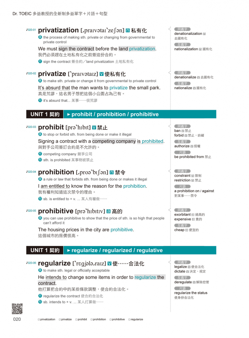 背單字時一併熟悉同反義字,理解英英釋義,就能避開考試陷阱!中英文分屬不同的語言系統,同個中文意思在不同情境時會使用不同的英文單字,為了幫助讀者正確使用,每個必考單字Dr. TOEIC多益教授皆補充單字的英英解釋、同反義字、片語,掌握書中的單字、片語、句型,題目怎麼出都不怕。