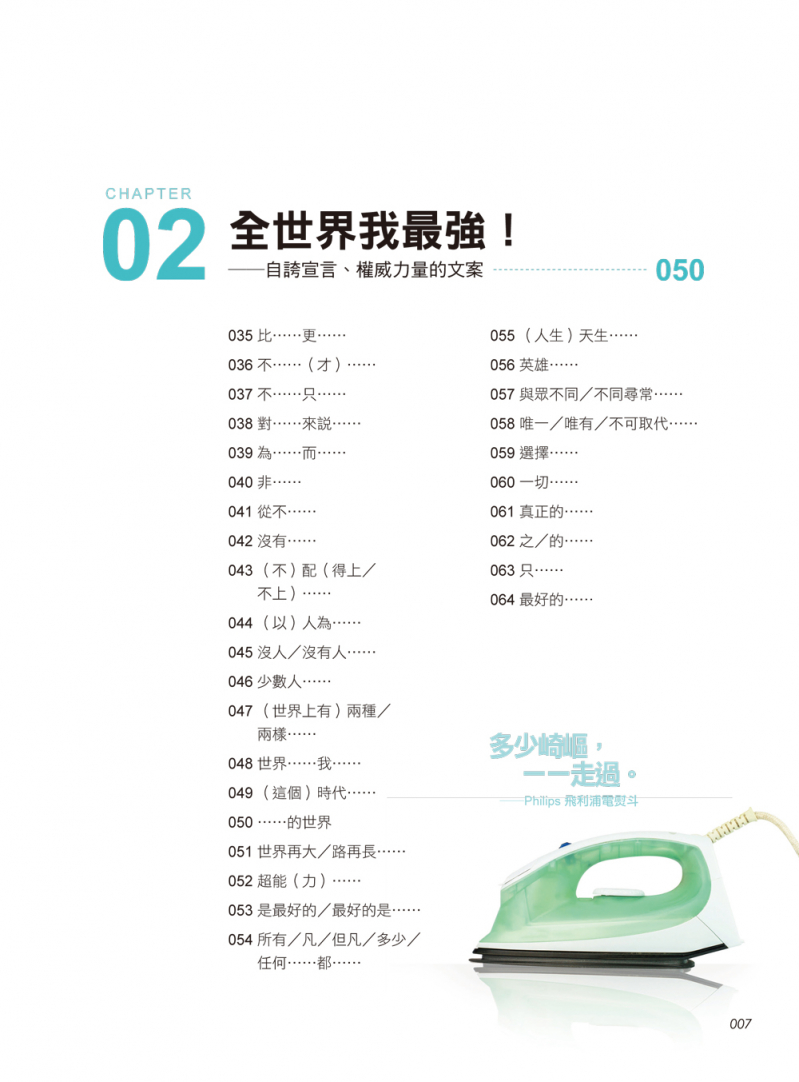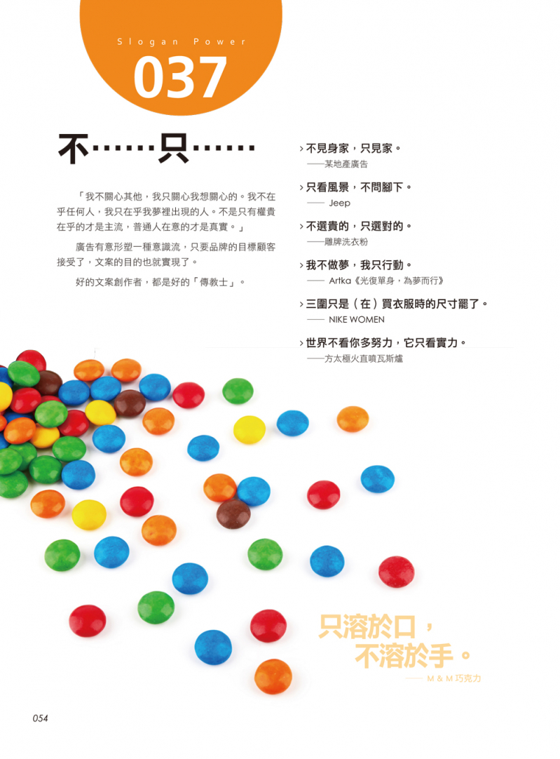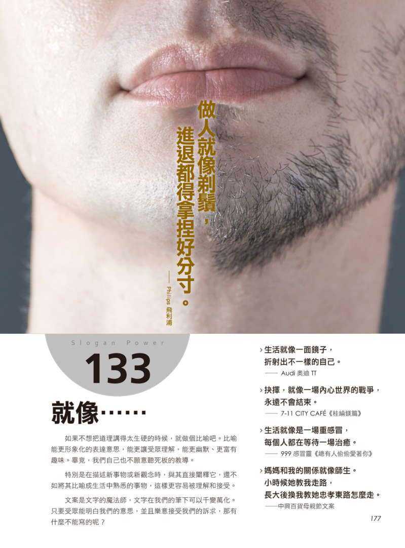 寫完文案後也需要與設計人員溝通設計方向,因此我們也以「圖像呈現」經典文案,以類似平面廣告的方式表現,希望能夠拋磚引玉,幫助讀者發想創意、與設計溝通。這本書的文案範例豐富,不僅有平面廣告,連社群媒體、宣傳影片的文案也都囊括在內,相信大家可以從這些句型、這些文案中,找出數萬種說故事的方式。