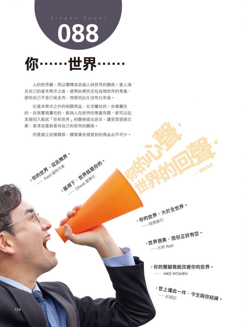 因為嚴格意義上,這本書裡出現了近500個廣告主或品牌名和1,000多條文案,意味著可能有500位廣告主、1,000位以上的文案人員參與創作了這些文案。