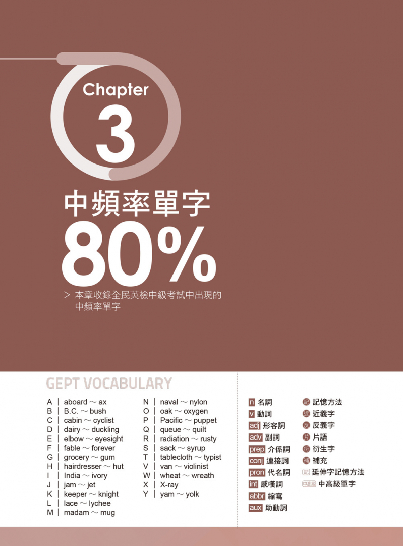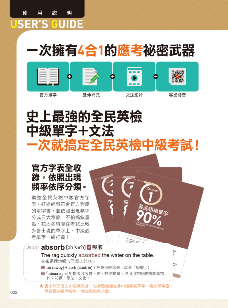 彙整全民英檢中級官方字表,打造絕對符合官方程度的單字書,並依照出現頻率分成三大章節,不怕搞錯重點,花太多時間在考試比較少出現的單字上,中級必考單字一網打盡!
