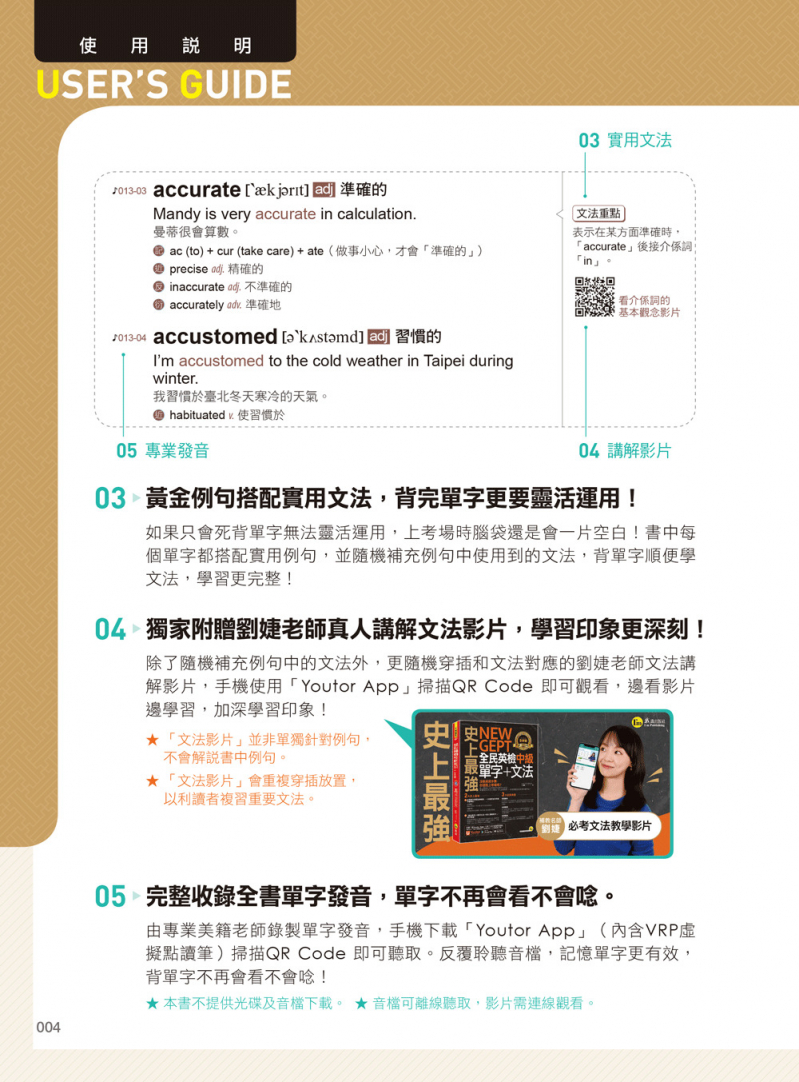 背單字順便學文法!書中單字除了搭配例句外,更補充說明重點文法,加上劉婕老師真人講解「文法影片」,手機使用「Youtor App」掃描QR Code即可觀看!