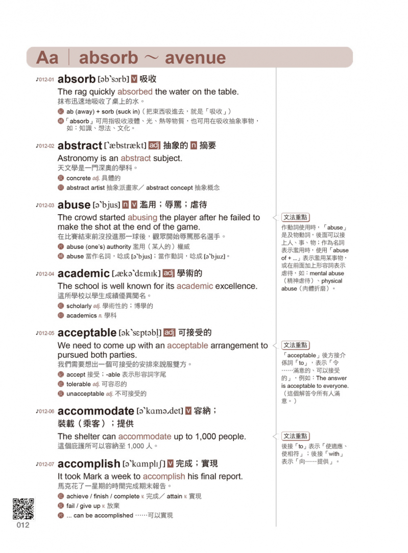 單字中英文、近反義字、片語、衍生字等全收錄。