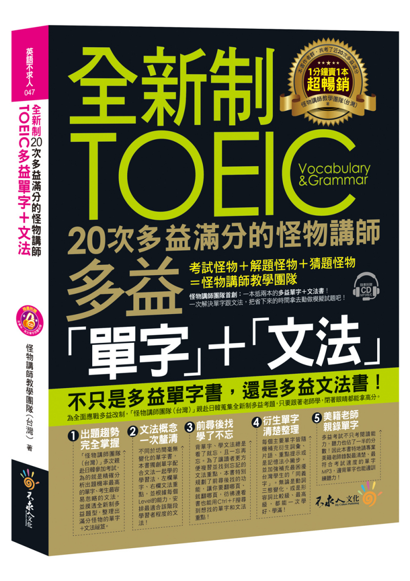 面對多益改制,相信不只是考生無所適從,多益講師也是各個如熱鍋上的螞蟻不知所措。為了因應此次改制,怪物講師教學團隊特別赴日、韓參加考試、蒐集考題,替考生摸透題型、分析單字,重新推出了這本《全新制20次多益滿分的怪物講師TOEIC多益單字+文法》。從整理單字開始,包含單字和文法的搭配、例句、難易度編排等等,整本書都是各個老師多年考試和教學的心血結晶,並且經過怪物講師團隊內部多次會議討論、修正才產出的內容。
