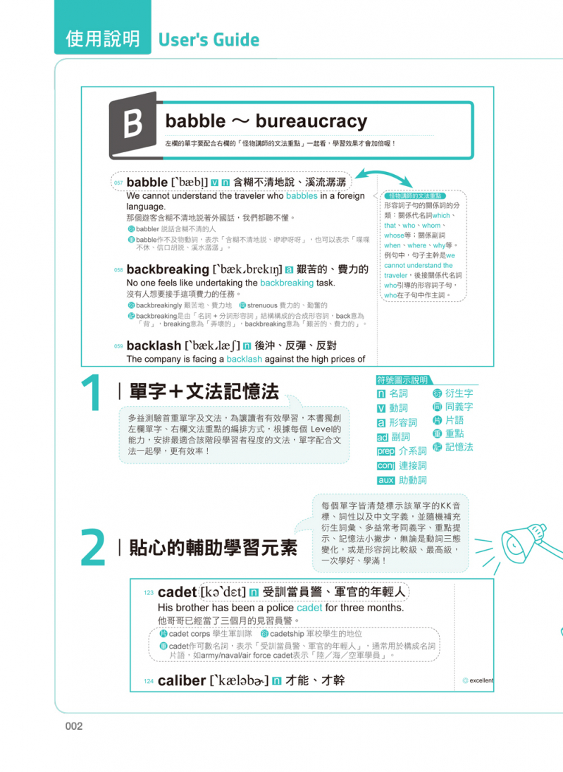 許多考生在準備多益考試時,不外乎是看參考書、多做試題等等,但在幾次赴日、韓參加多益考試的經驗中,我們發現多益考試中決勝的關鍵除了答題速度外,最困擾臺灣學生的就是考試中會出現的「同義字」,因此這次改版我們也特別為書中單字補充了同義字,幫助考生們能夠更快速地累積單字量,唯有增加單字量才能夠在答題時又快又好。當然,文法是任何英文考試中都不能忽略的部分,但是單獨學習文法是相當枯燥乏味的,因此怪物講師教學團隊特地設計單字搭配文法的學習方式,背完左欄的單字、看完例句的同時立刻學習相關文法,可以有效地整合資訊、提升學習成果。