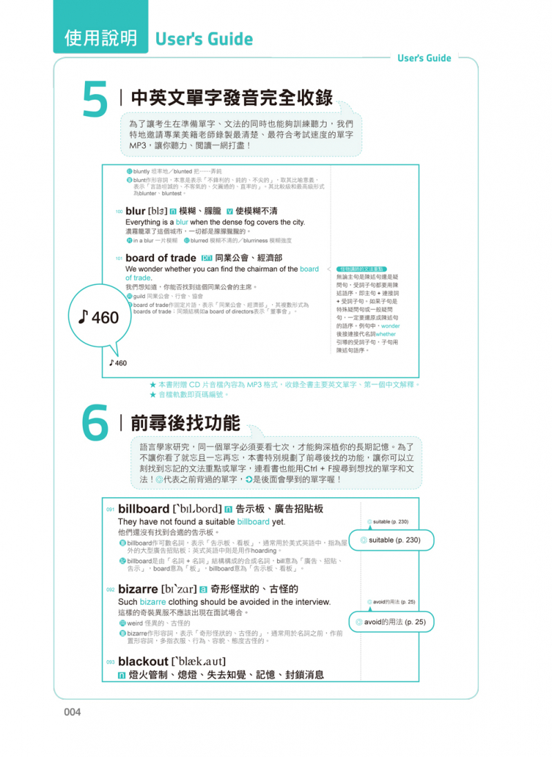 怪物講師教學團隊堅信,不斷地複習是成為英文高手的不二法門,為了幫助考生複習所學過的內容,書中也特別設計了「前尋後找」功能,只要翻書就能找到忘記的單字或是想加強複習的文法概念,透過一次次地複習,不但可以加深印象,也更能夠幫助自己檢視學習效果!