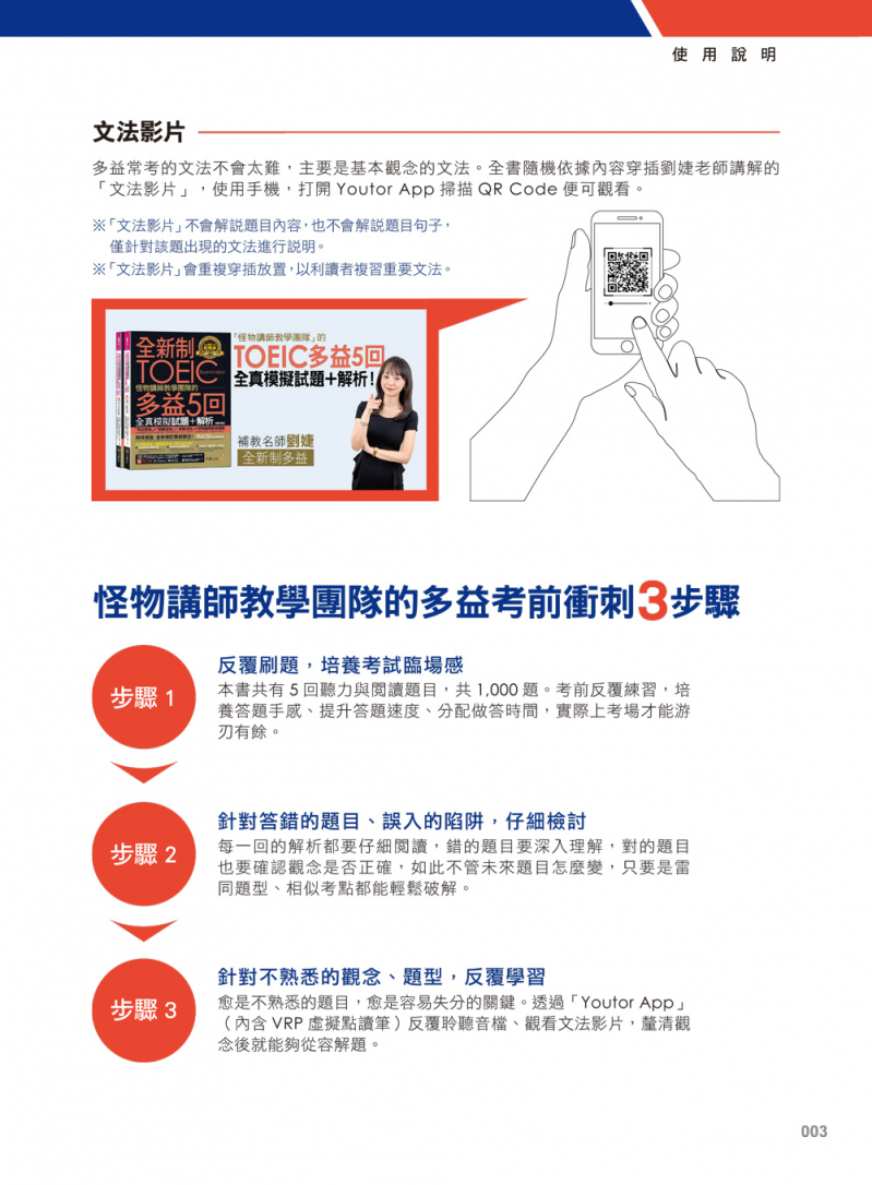 修訂版的內容新增擬真題型,幫學習者精準匡列高頻單字、常見句型以及多益情境。另外為了讓本書使用成效最大化,出版社特別研發「Youtor App」,內含VRP虛擬點讀筆的功能,讓學生可以使用手機隨掃隨聽,不管是練習或是逐題複習都非常方便。