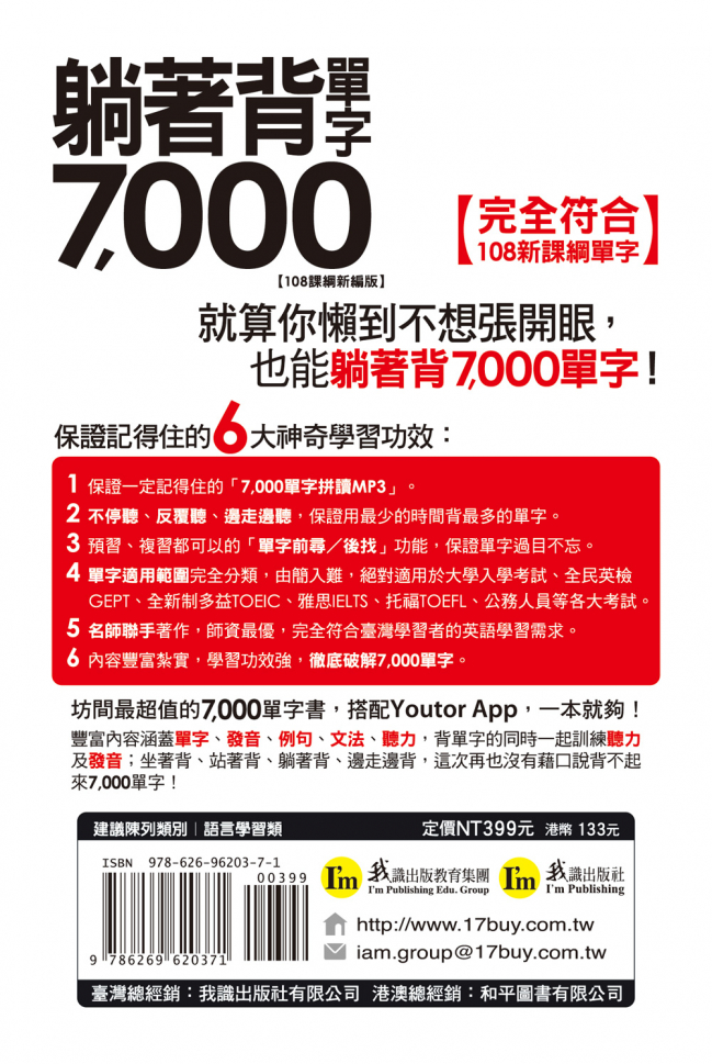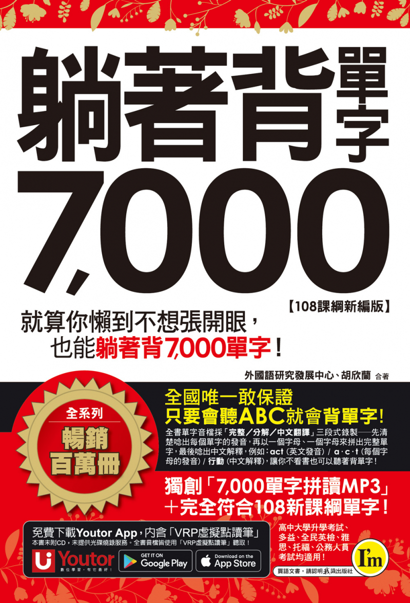 在內容的規劃上,我們回歸到單字書的本質——內容精簡但絕不能少了重點、一定要有精闢的例句讓讀者得以理解單字如何被應用在句子中,並且要能夠輕鬆攜帶、輕鬆閱讀和聆聽。所以我們設計了這本《躺著背單字7,000【108課綱新編版】》,不只有較小且輕便的書本尺寸、完善的7,000單字內容,更有獨創保證記得住的「7,000單字拼讀音檔」,錄製方式採「完整/分解/中文翻譯」三段式將全書單字錄製於音檔裡,讓讀者真的能夠隨時地背讀單字。