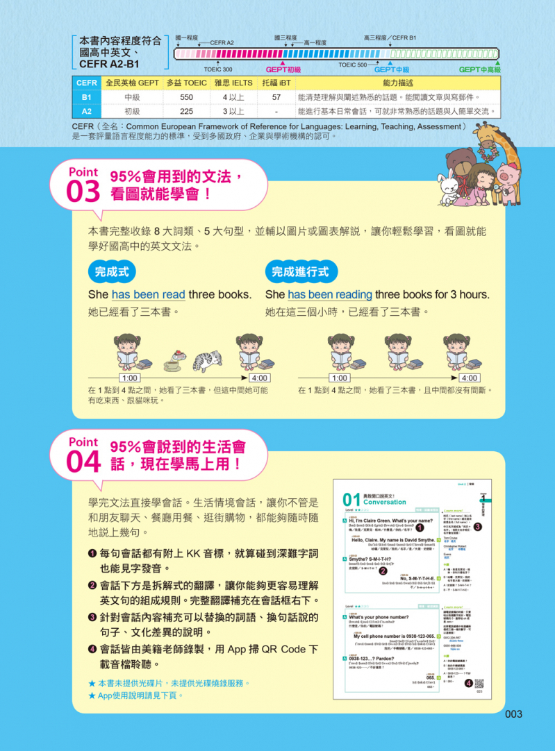 在講解文法的過程中,也會補充必備的單字、情境會話,而為了讓自學者更容易理解英文句結構,特別在會話句下方按照英文句的結構逐段翻譯成中文。且會話句也都附上KK 音標,便於學習者見字發音,再搭配音檔練習。