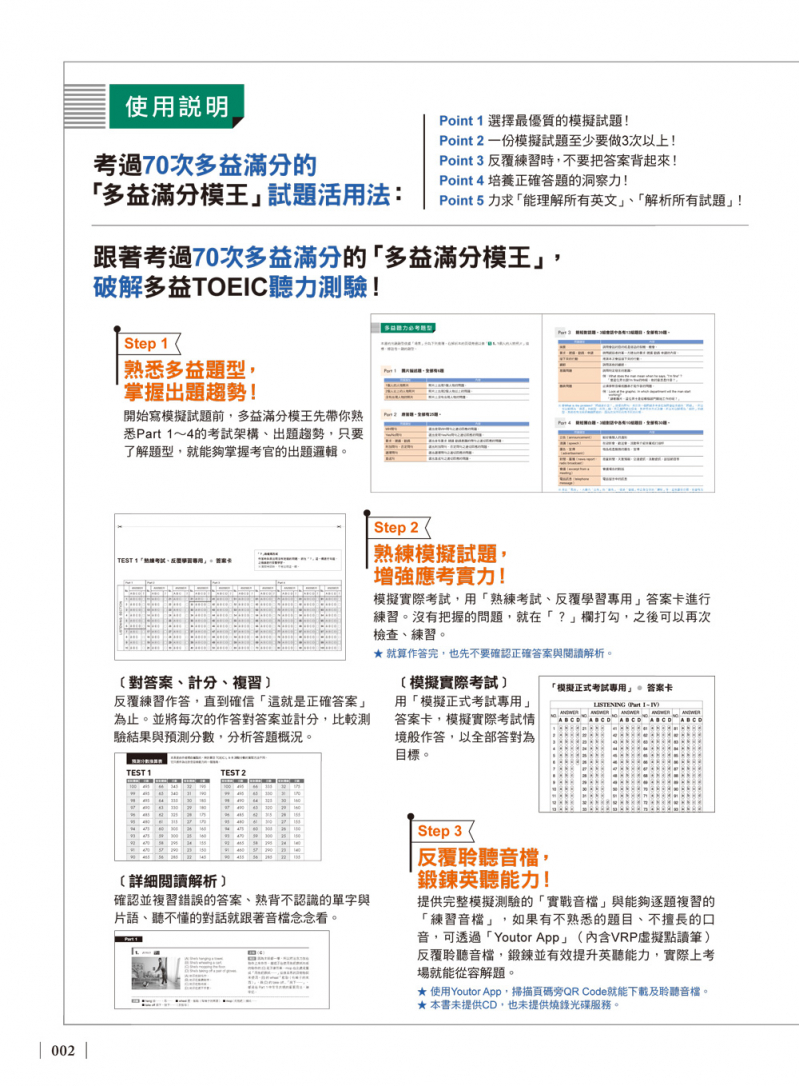 這次,我們有了創作那樣的書的機會了。我們完成了真正具實力的,收錄題數為500題的模擬試題了。如果把之前的作品當成是基礎篇的話,那麼這本《70次滿分的「多益滿分模王」多益TOEIC聽力模擬試題 + 解析》就算是實踐篇了。本書也是根據參加測驗的經驗,傾注了我們所有的知識,嚴格挑選出每道試題,重現試題的程度跟出題方式等實況。