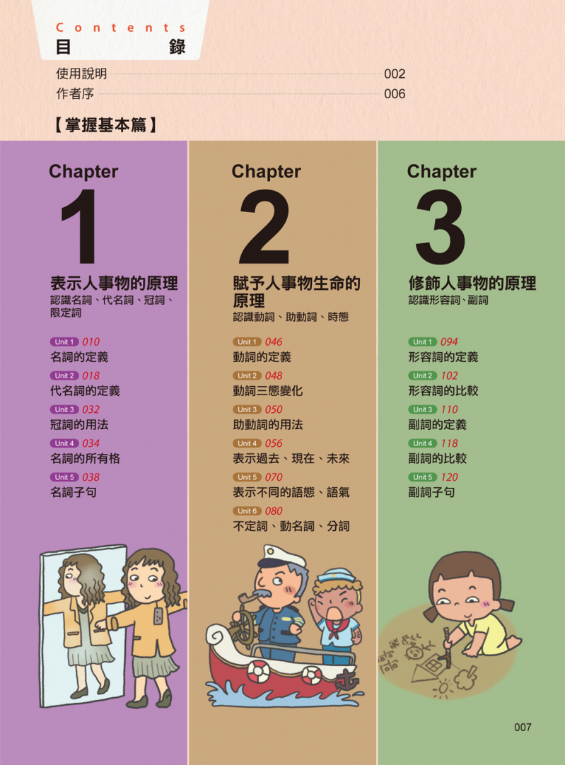 在非英語環境長大的我們,想要學好英文,就一定要有文法概念。本書以文法為學習主軸,向外延伸學習單字與會話,聽說讀寫一次加強,發音、單字、會話、文法一次學會。