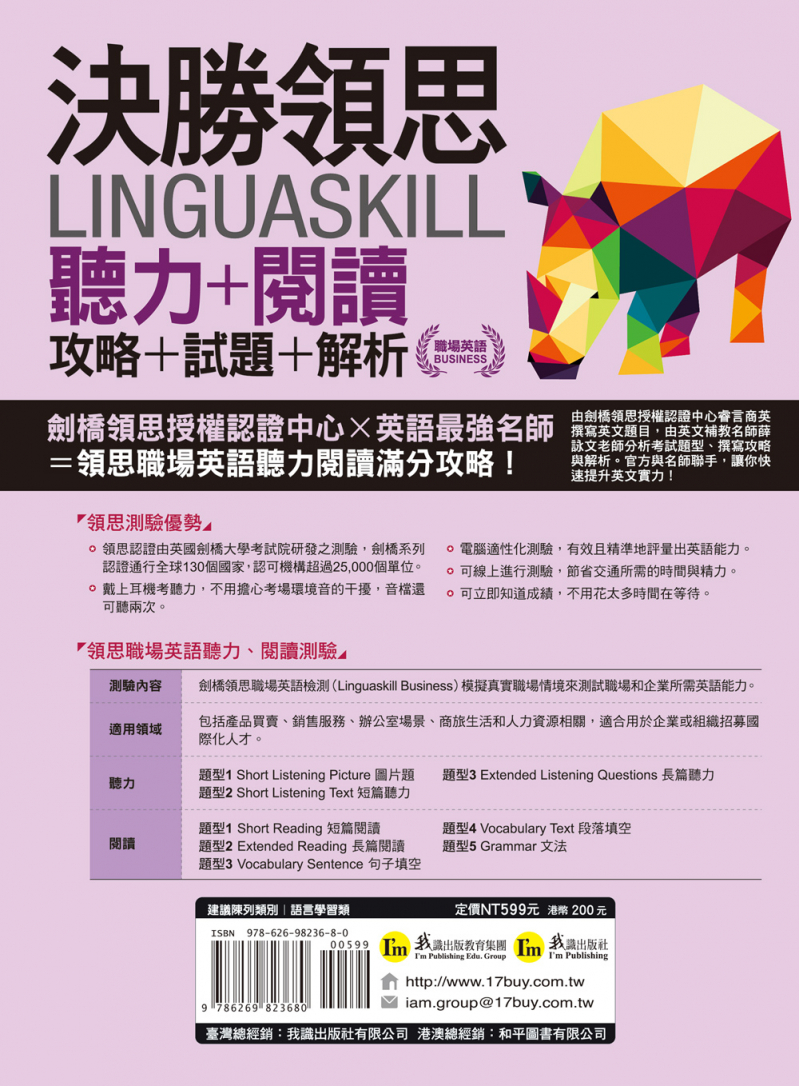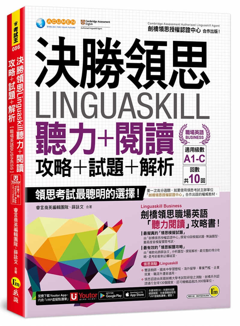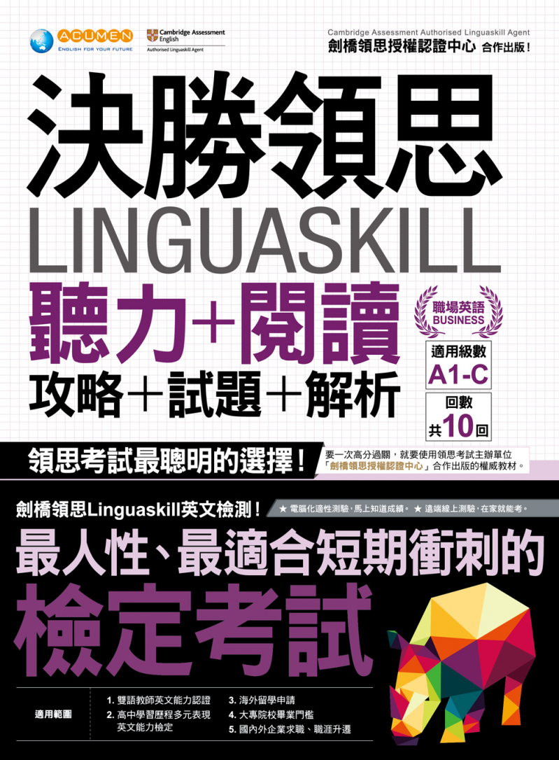 欣聞劍橋大學語言測評考試院在臺灣授權認證的睿言商英顧問股份有限公司與我識出版社共同合作出版《決勝領思Linguaskill 聽力+閱讀攻略+試題+解析【職場英語Business】》,進一步介紹和推廣領思。本書不僅為應試者提供考前準備方向與相關題型解析,同時也讓一般讀者能透過練習來了解自己當下的英語文能力,更為英文教師、企業訓練與人力資源部門的人員提供領思的完整說明。