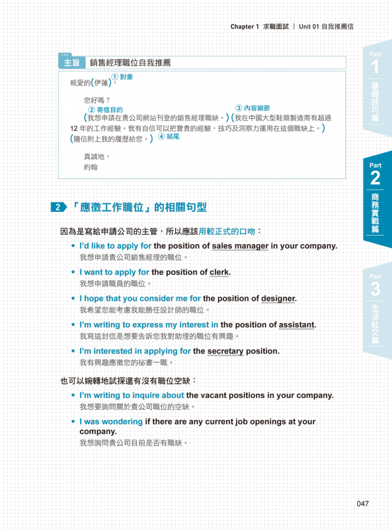 那次的對話,促成了這本《抄好學Email書信大全:邊抄邊學150封商業Email範文!》問世的機緣。她跟我說,很多人以為Email就是把中文想講的話翻譯好、寫成英文就可以了,但其實一定要「釐清目的」,而且還要懂得判斷情況。另外,Email還可以用來談判,傳達出對自己有利的內容。那次她跟我說了很多,我當下就被她圈粉,覺得她累積多年的智慧、心法跟經驗一定要傳承下去。