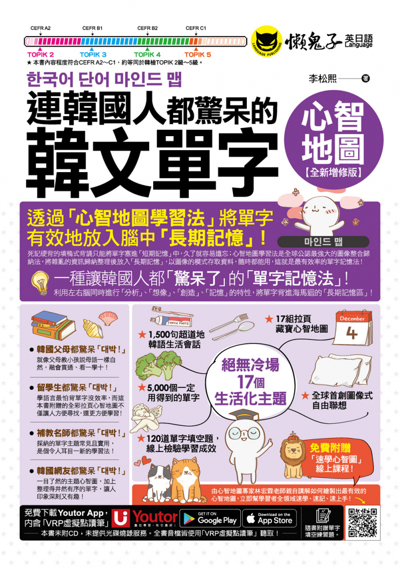 【能力分級】 《連韓國人都驚呆的韓文單字心智地圖【全新增修版】》本書符合: CEFR A2-C1,約等同於韓檢TOPIK 2-5級。