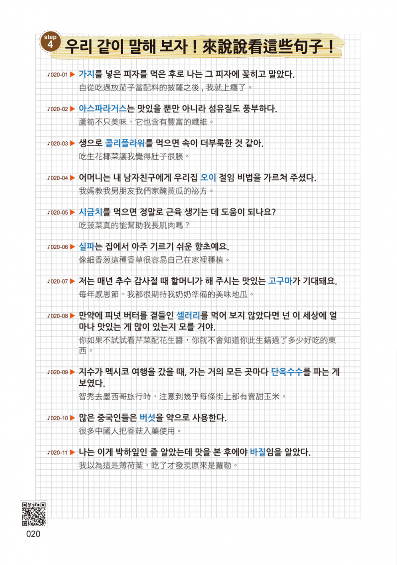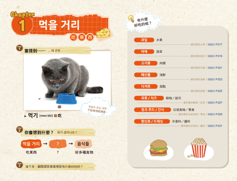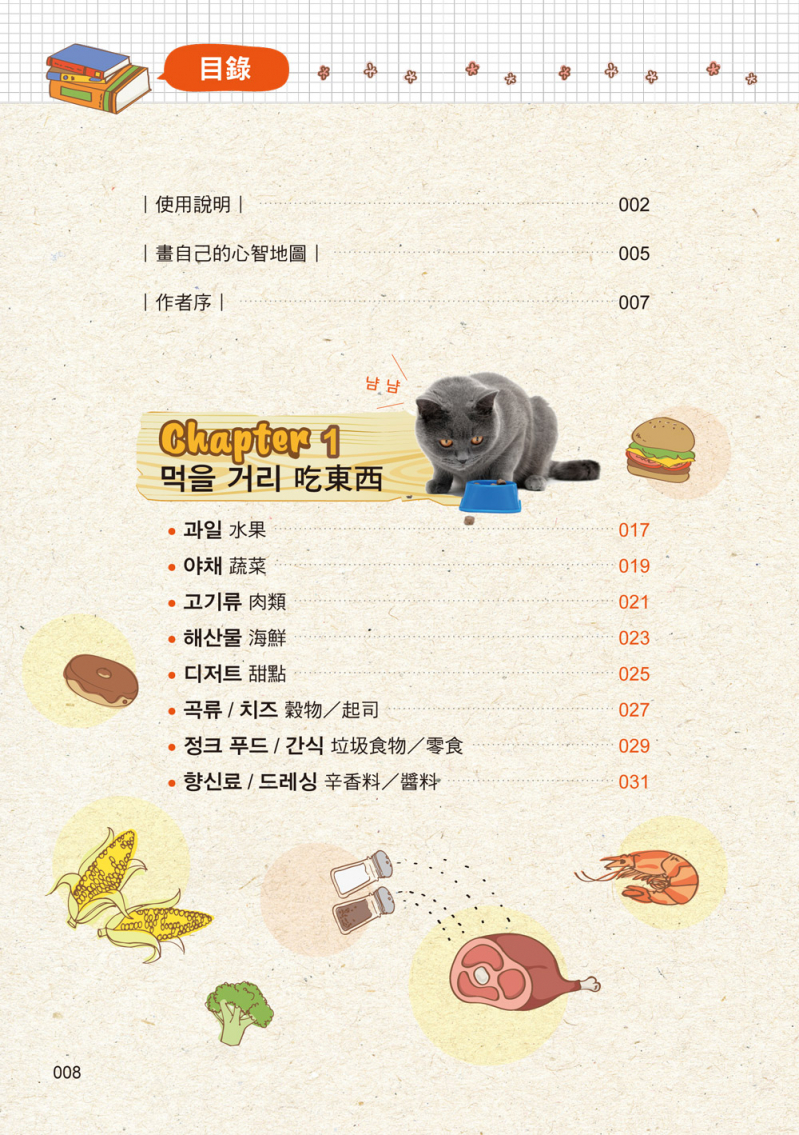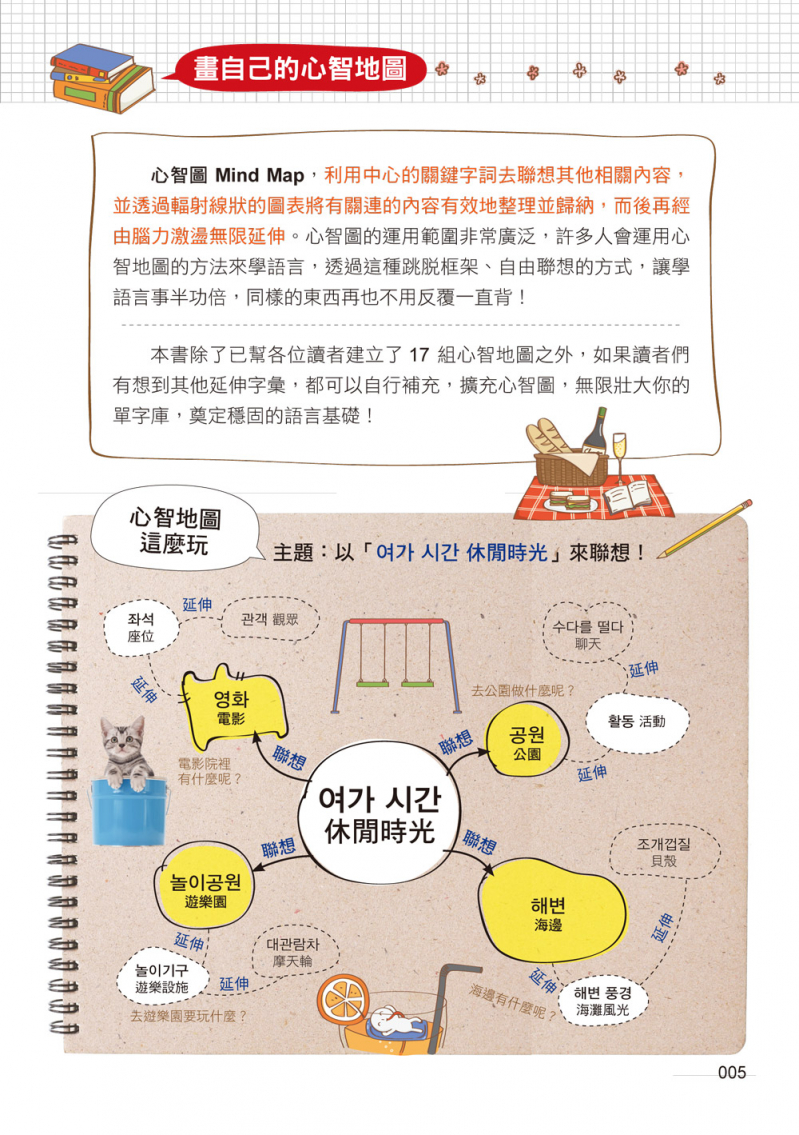 主題聯想→動動手指→學習會話→無限延伸→聽音檔複習 Step1主題聯想 先訂定主題,例如看到「吃東西」,你有什麼想法呢?吃水果?吃海鮮?加調味料?腦中有沒有漸漸浮現一些相關的內容呢? Step2動動手指、翻開拉頁 快動動手指翻開對應的單元,看看有哪些單元中的單字是剛剛有想到的,又有哪些是被遺忘的呢? Step3學習會話 單字學了就是要會用,不然根本就白學了!熟悉單字之後來看看要如何將單字靈活運用在會話中吧! Step4無限延伸 在單元中若有聯想到其他的單字就立刻寫下來,將心智圖無限延伸,壯大你的單字庫。 Step5聆聽音檔,加深印象 書中的每個單字及例句皆有韓籍老師親自錄製的音檔,只要在手機下載「Youtor App」(內含VRP虛擬點讀筆)掃描QR Code 即可聽取。只要有書+手機,隨時都能輕鬆學韓文。