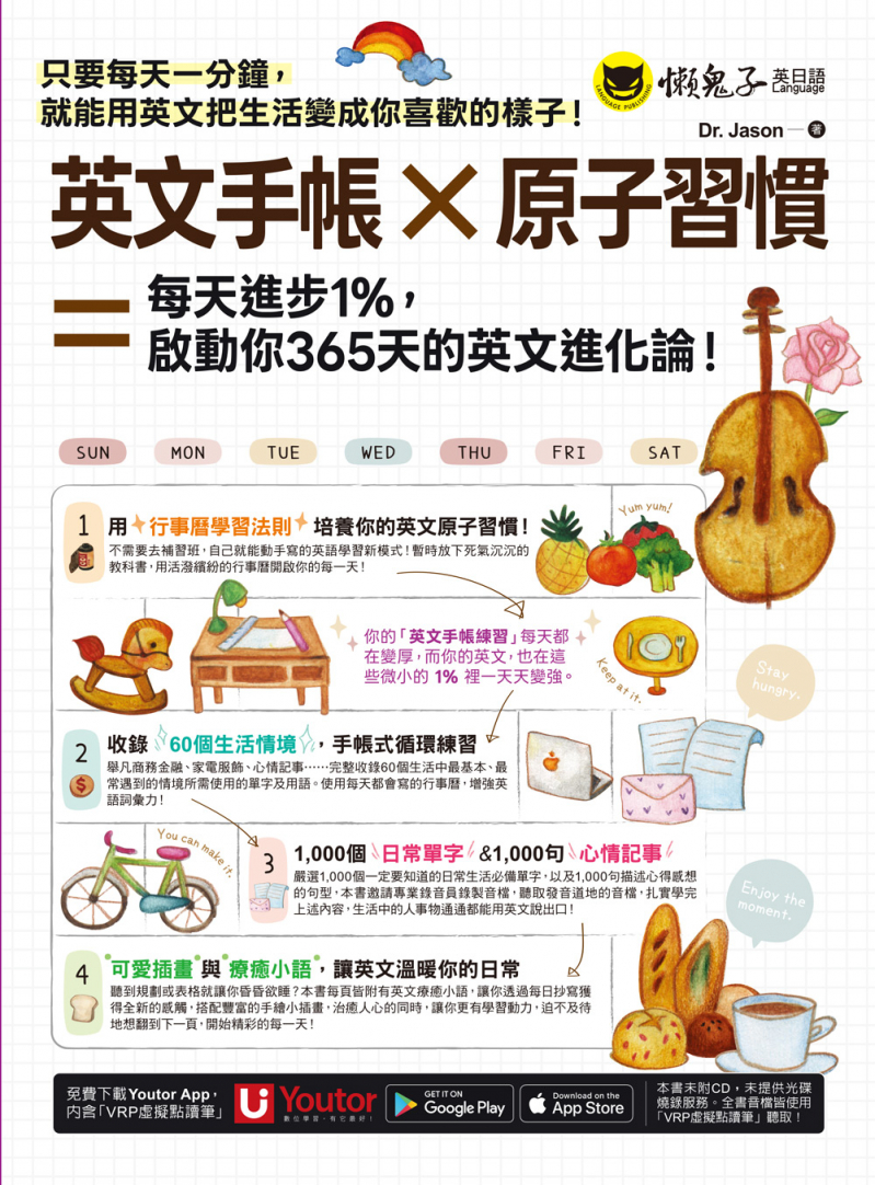 本書以「行事曆」為學習核心,將每天化成一個「英文微行動」。不需補習、不用死背,只要每天1分鐘、進步1%,就能啟動365天的英文進化論,透過日復一日的紀錄與書寫,你會逐漸建立自己的語感節奏,讓英文在生活中自然成長。。