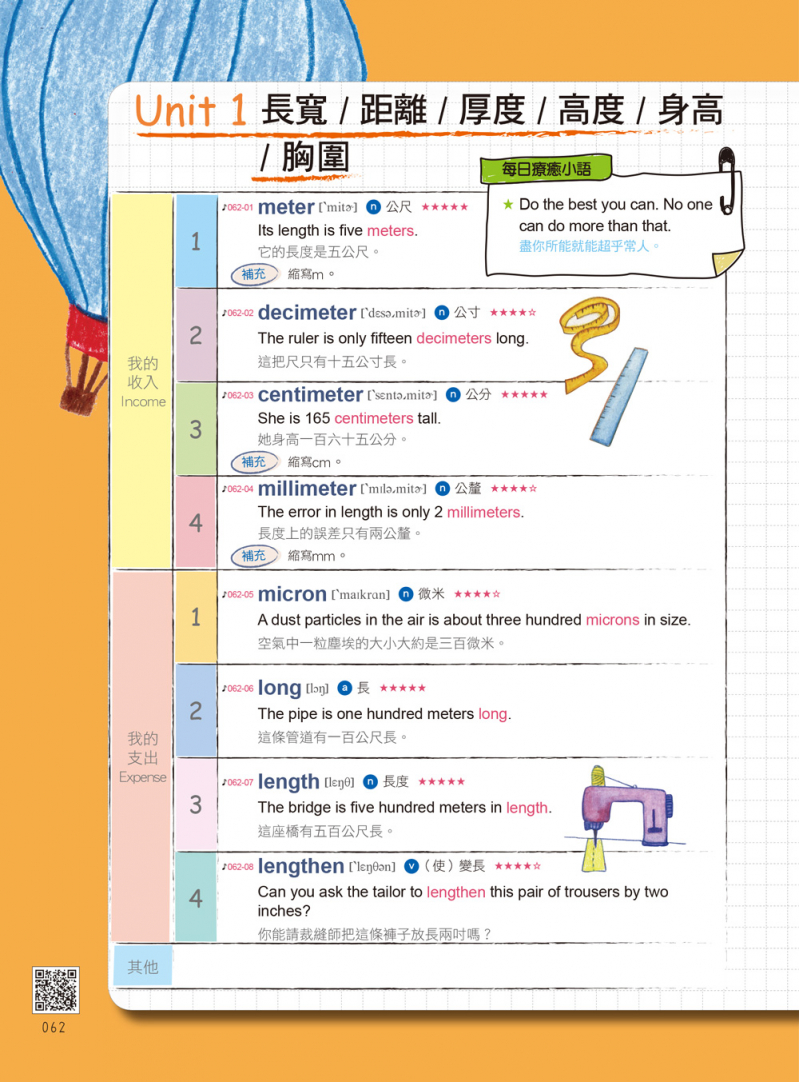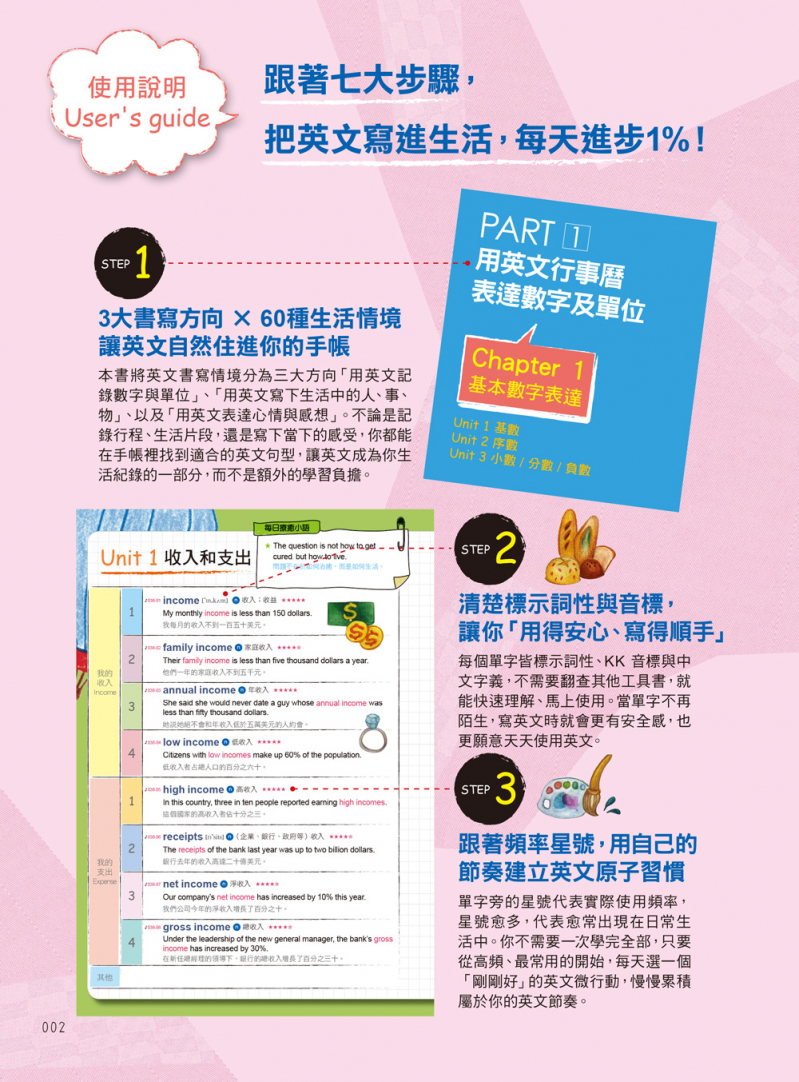 本書將英文書寫情境分為三大方向「用英文記錄數字與單位」、「用英文寫下生活中的人、事、物」、以及「用英文表達心情與感想」。不論是記錄行程、生活片段,還是寫下當下的感受與想法,你都能在手帳裡找到適合的英文句型,讓英文成為你生活紀錄的一部分,而不是額外的學習負擔。