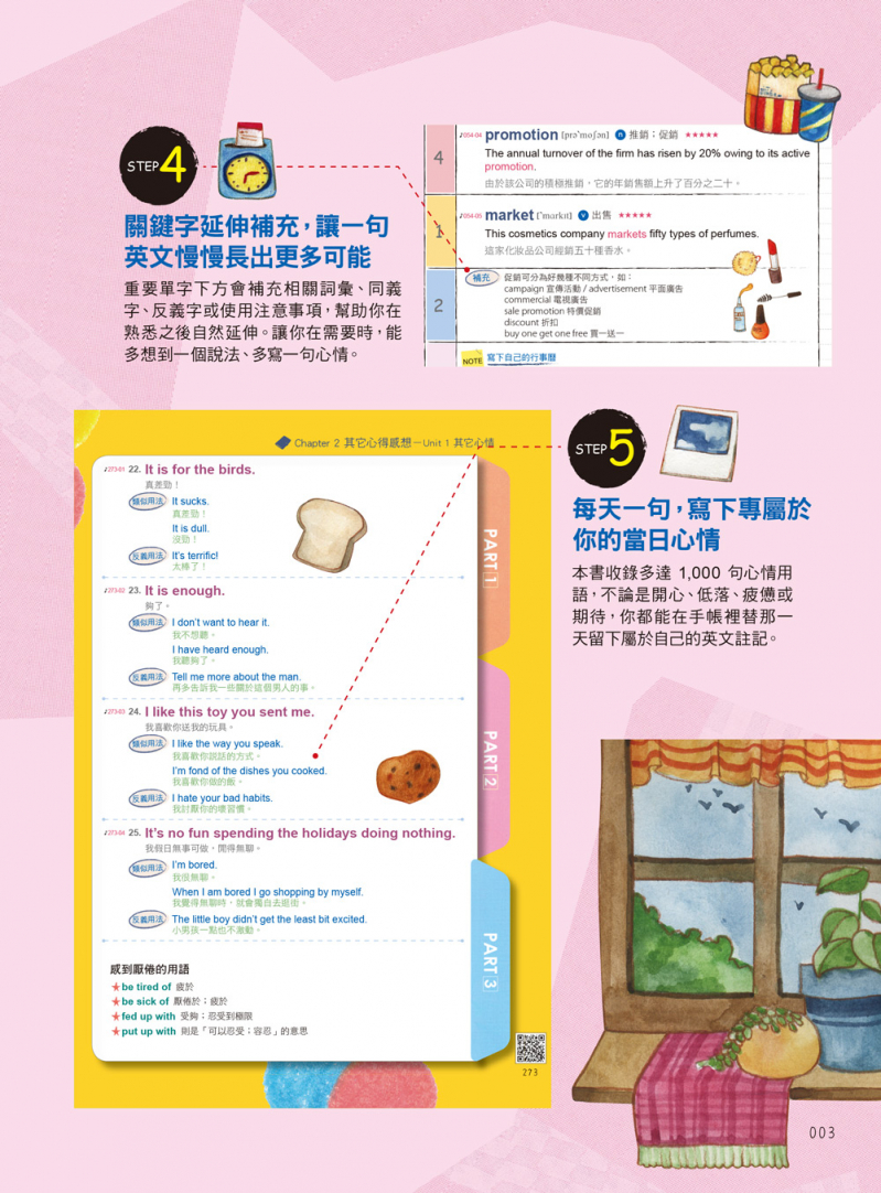 本書收錄多達 1,000 句心情用語,不論是開心、低落、疲憊或期待,你都能在手帳裡替那一天留下屬於自己的英文註記。