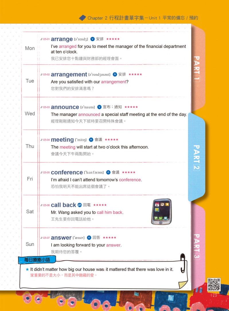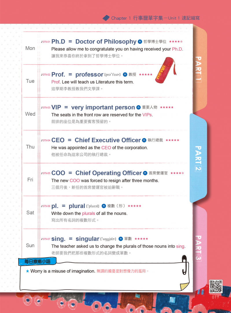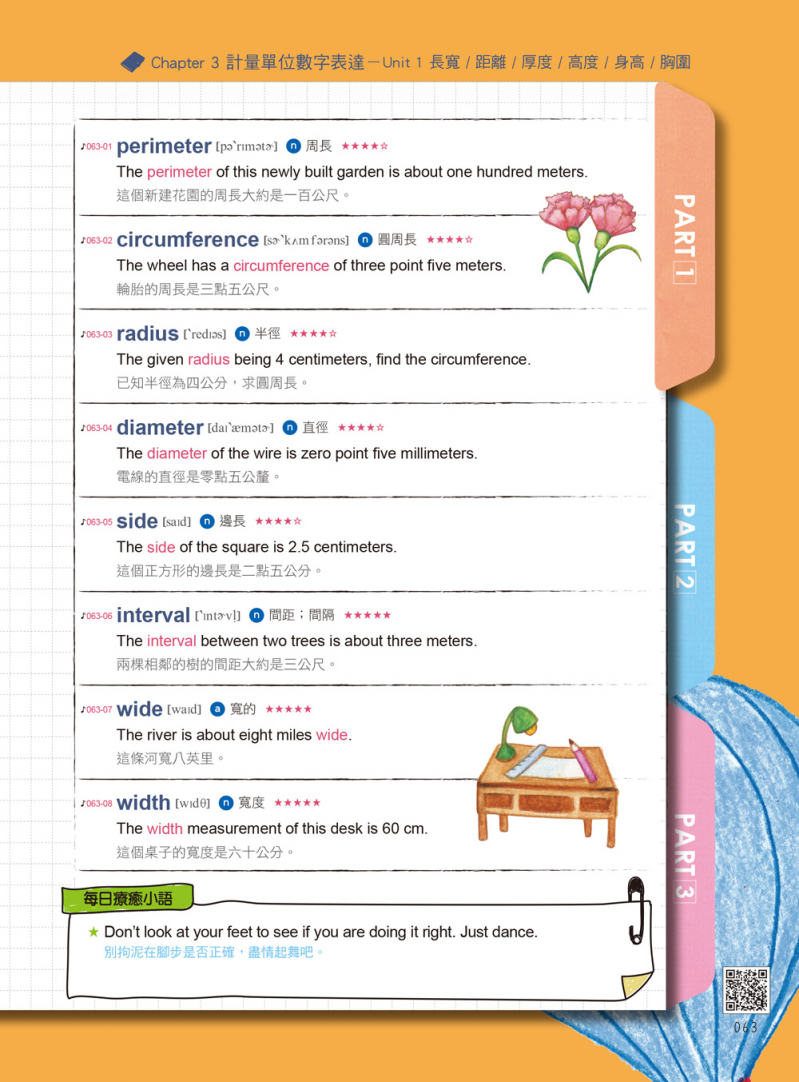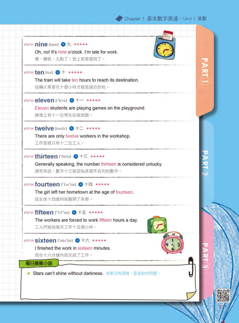 *音檔內容說明:本書為使學習者奠定穩固的基礎,在Part 1的部分特別錄製了單字、例句中英音檔,Part 2及 Part 3則配有單字中英音檔。