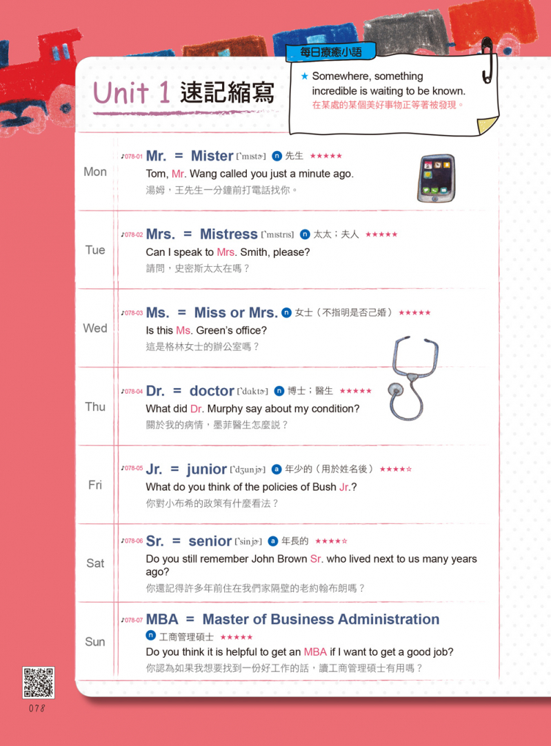 從商務金融、家電用品、服飾搭配到心情記事,本書精選60個最日常、最能寫進手帳裡的英文情境。透過「手帳式書寫練習」,你每天都能像記錄生活一樣,用英文寫下一句當天的感受、行為或想法,讓語感自然在你的生活節奏中累積起來。