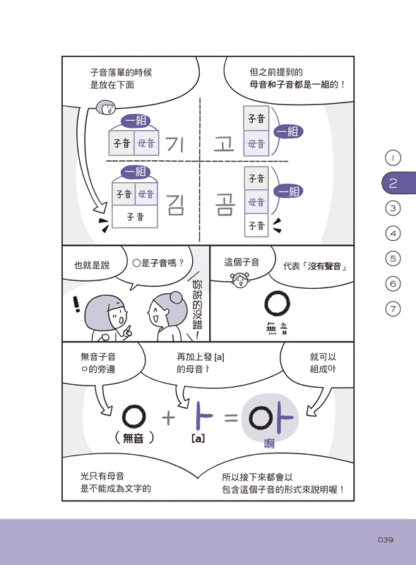 用漫畫說故事的方式,7天輕鬆學習韓語40音的源起、母音、子音、終聲和發音規則。每看完一個章節,就好像上完一堂輕鬆的小學韓語課!