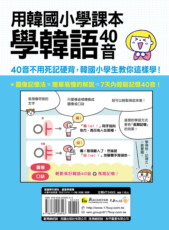 由日本專職插畫家用可愛的插圖將40音圖像化,再搭配韓文老師簡單好記的口訣,不只輕鬆背好40音,更能加深印象、長期記憶發音。