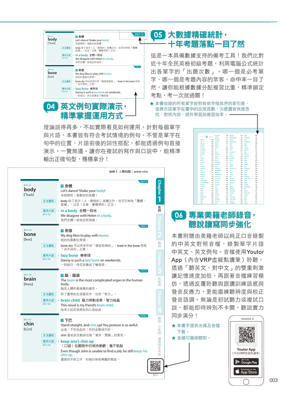 本書附贈由美籍老師以純正口音錄製的中英文對照音檔,錄製單字片語中英文、英文例句。音檔使用Youtor App(內含VRP虛擬點讀筆)聆聽,透過「聽英文、對中文」的雙重刺激讓記憶速度加倍,再跟著音檔練習模仿,透過反覆聆聽與跟讀訓練語感與發音反應力,更能磨練聽辨度與校正發音語調。無論是初試聽力或複試口說,都能即時辨別不卡關,聽說實力同步滿分!