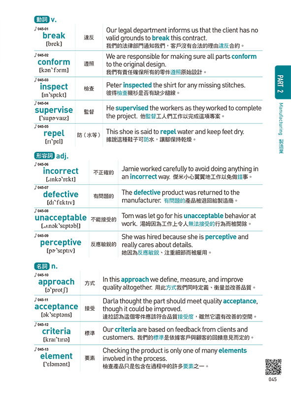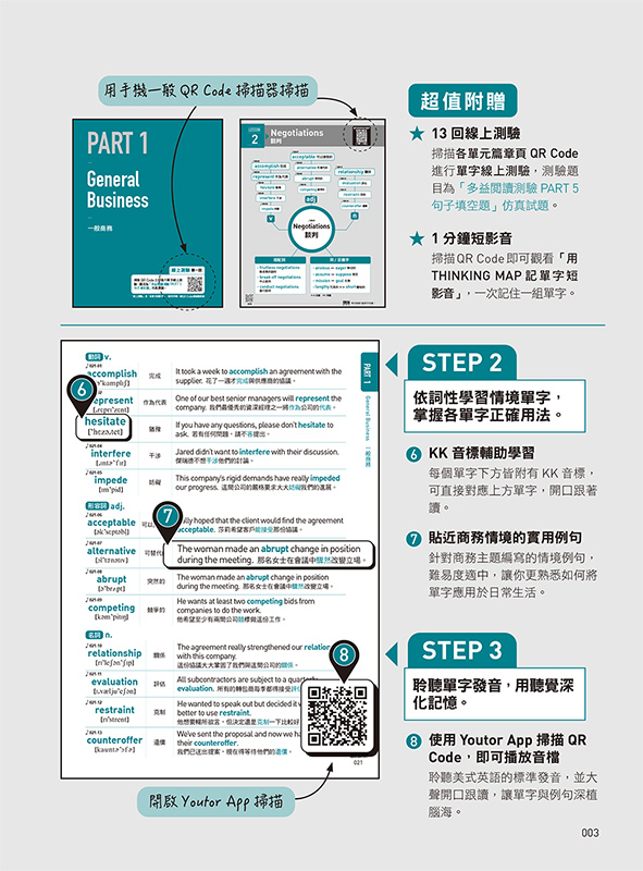 針對商務主題編寫的情境例句,難易度適中,讓你更熟悉如何將單字應用於日常生活。