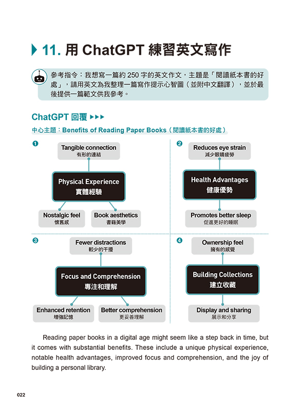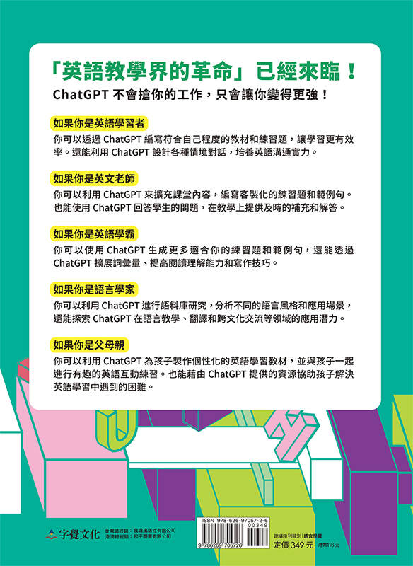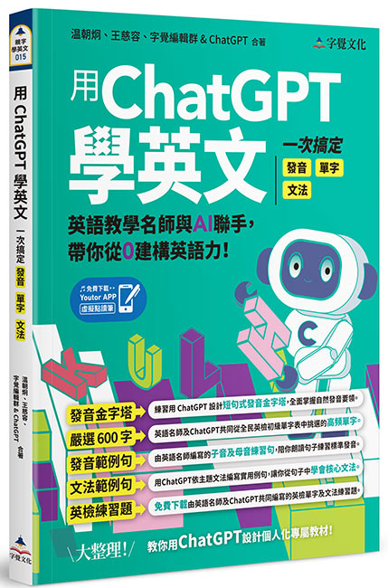 《用ChatGPT學英文:一次搞定發音、單字、文法》為你整理出12種用ChatGPT學英文的方法,包括查詢單字、製作單字表、編寫文章、出模擬試題、訂學習計畫、設計寫作心智圖……等等。只要善加利用,ChatGPT就是最棒的個人家教。找到最適合你的方式,就能達成最有效的學習!