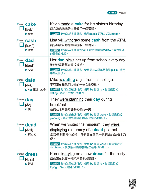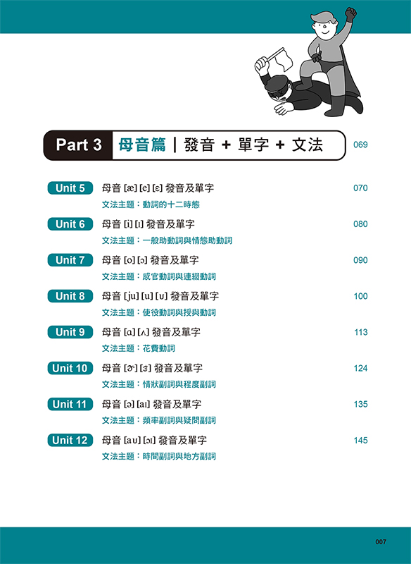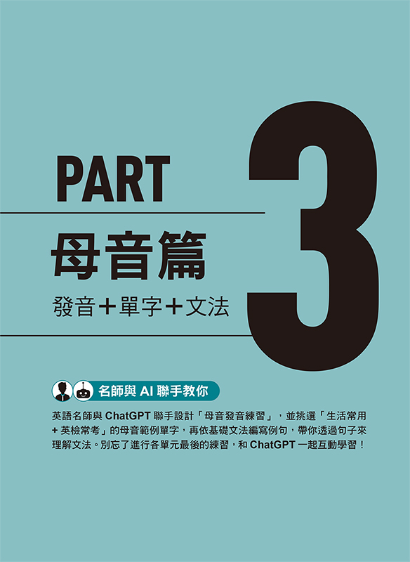 Part 2-4 分別以「子音、母音、混音」的發音規則為架構,帶你學習相關單字與重點文法。