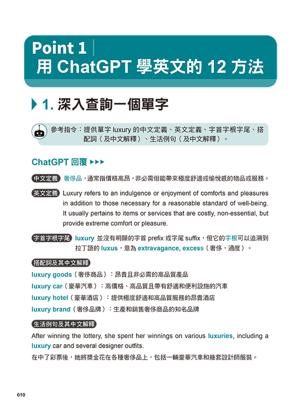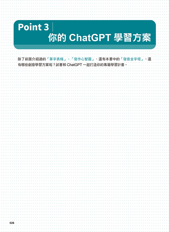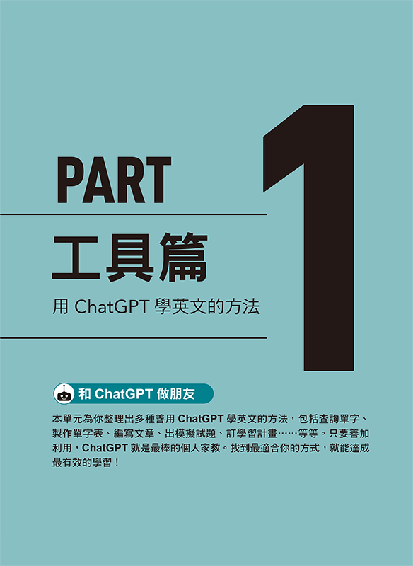 在Part 1 工具篇當中,你將獲得用ChatGPT學英語的12種參考方案及注意事項。