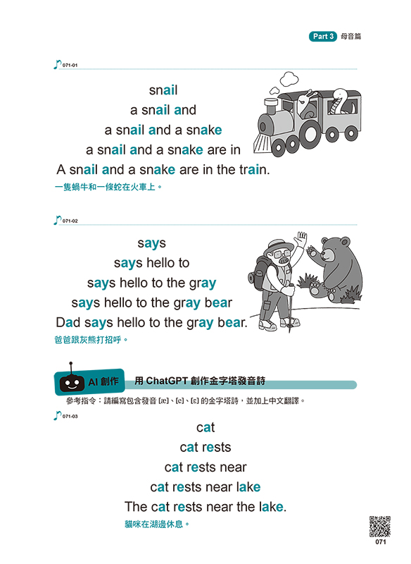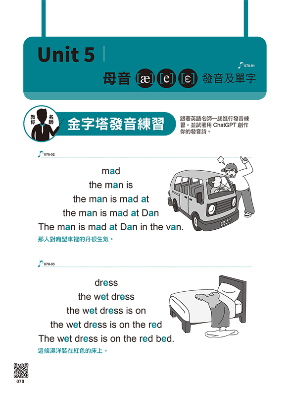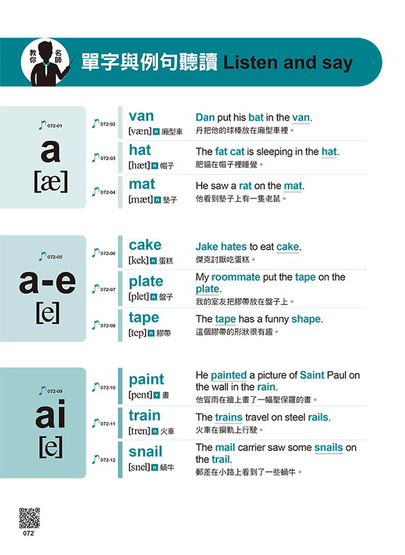3. 單字與例句聽讀:由温朝炯、王慈容兩位老師編寫的發音練習句,帶你熟悉單字發音。