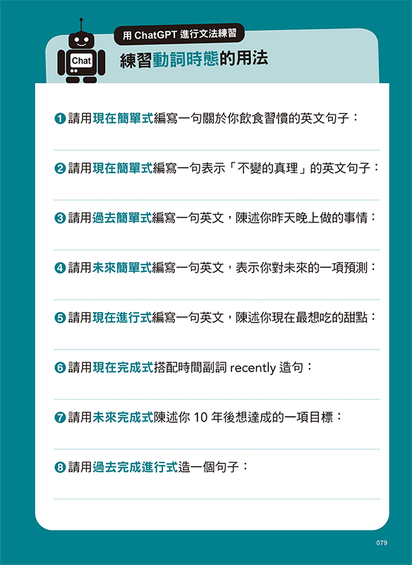 6. ChatGPT文法練習:自己練習操作,下指令讓ChatGPT編寫句子,更能掌握文法規則。