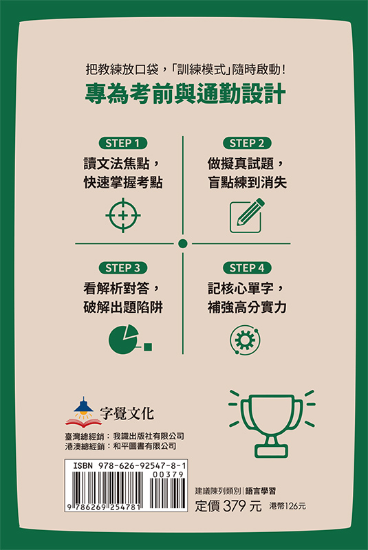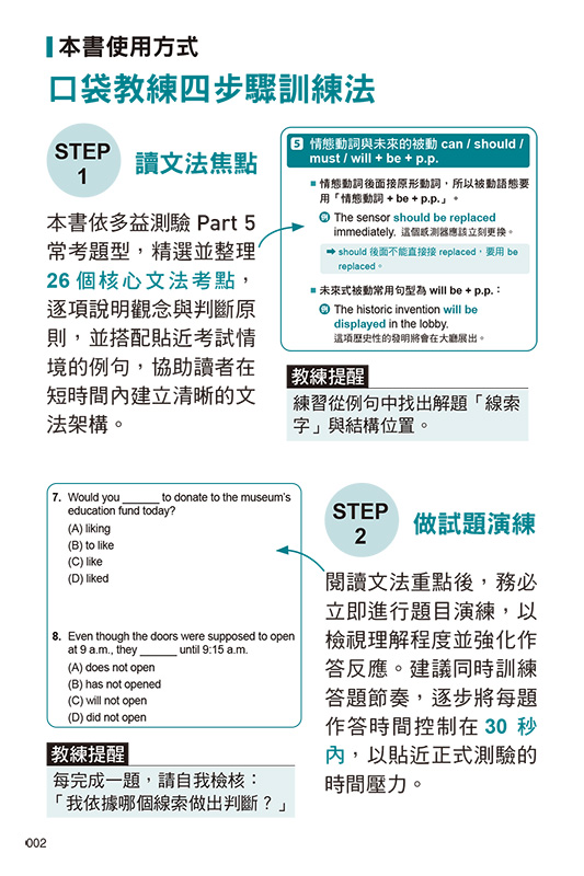 本書依多益測驗Part 5常考題型,精選並整理26個核心文法考點,逐項說明觀念與判斷原則,並搭配貼近考試情境的例句,協助讀者在短時間內建立清晰的文法架構。