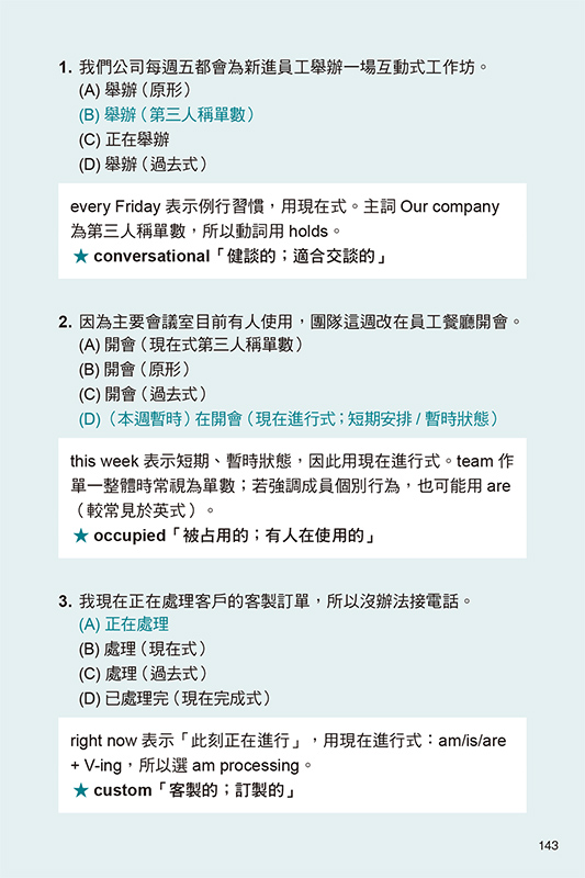 本書試題演練所用字彙多為多益測驗Part 5常見用字與搭配。請特別留意自己不熟悉的單字,建議查閱字典掌握其:常見詞性變化、固定搭配、常用語意與用法。