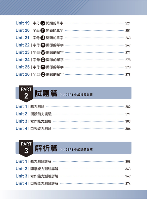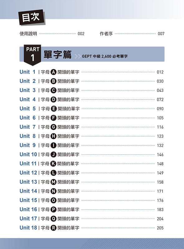 收錄財團法人語言訓練測驗中心公布之「中級參考字表」約2,600個單字,每字皆搭配實用例句幫助讀者掌握單字用法。熟記本單元的所有單字,是輕鬆應考的第一步。