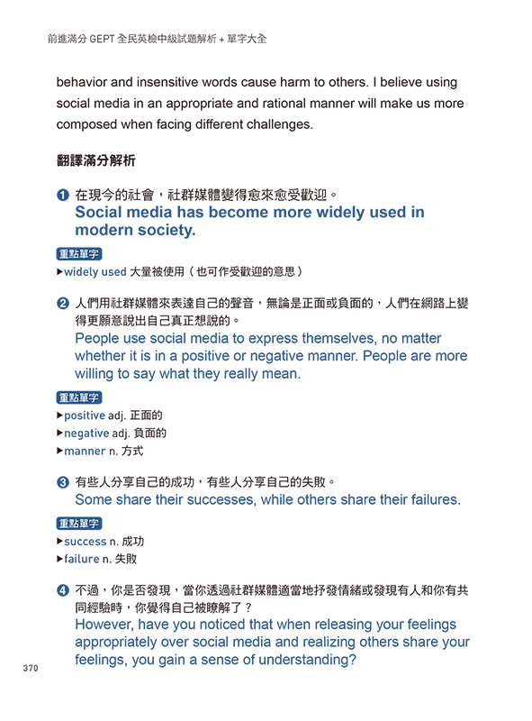 針對PART2的模擬試題,逐題附上「滿分解析」,協助讀者在核對答案的過程中釐清題目中的文法考點,對於複試的口說及寫作測驗,亦補充實用的作答技巧。