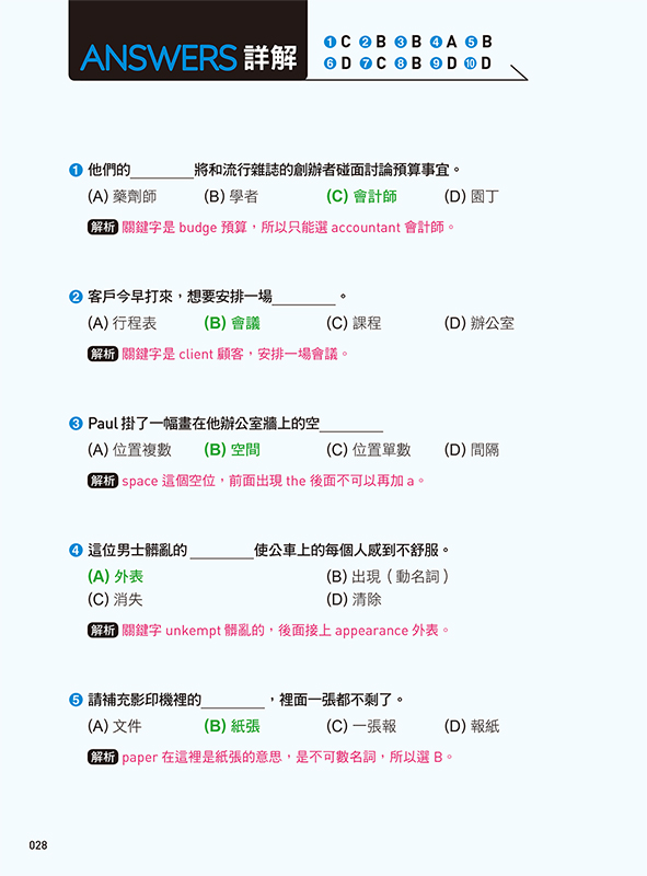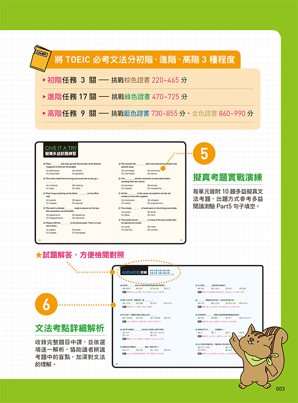 每單元皆附10題多益擬真文法考題,出題方式參考多益閱讀測驗「Part5句子填空」。搭配完整題目解析,協助讀者辨識考題中的盲點,加深對文法的理解。