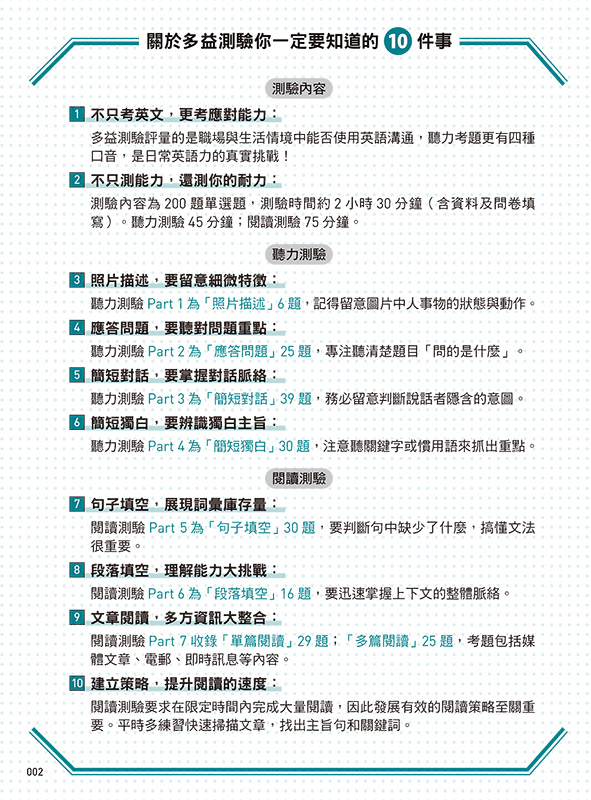簡單、快速、有效,是我們編寫這本書的主要精神。期待為準備多益考試的你,提供一個好用的工具。