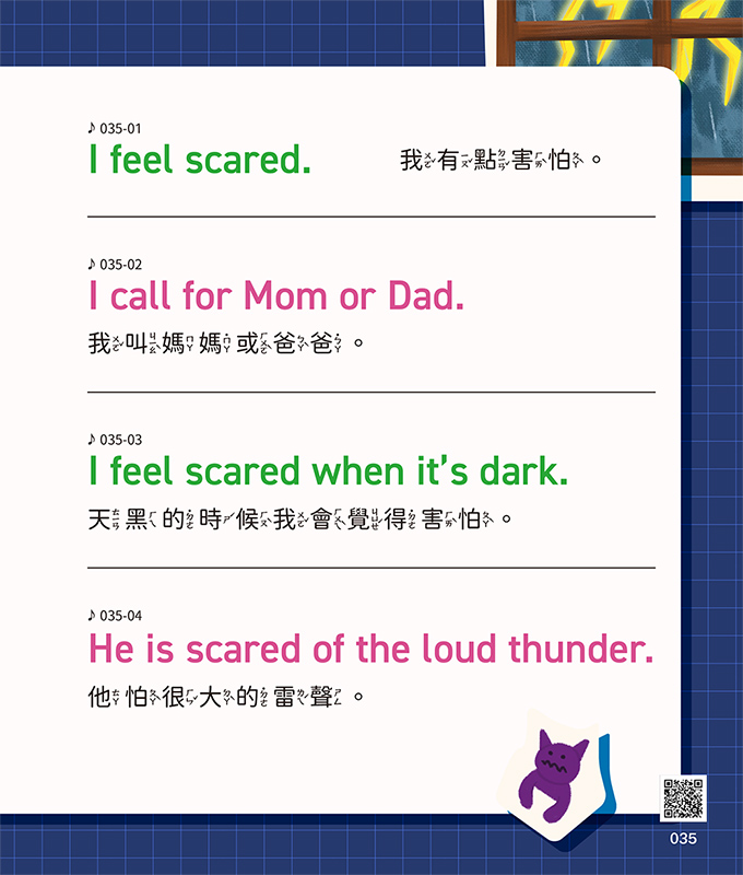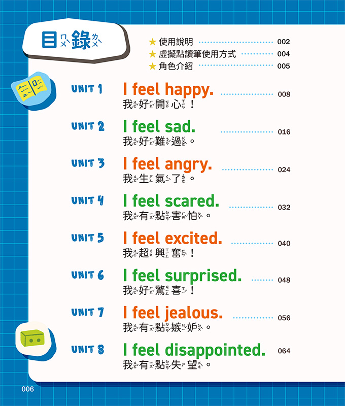 收錄孩子最常遇到的15種情緒,透過情境插圖與簡單句型,鼓勵孩子用英文說出自己的感覺,例如 I feel happy.、I feel angry.。