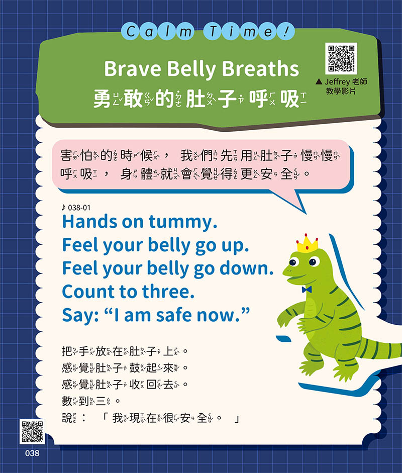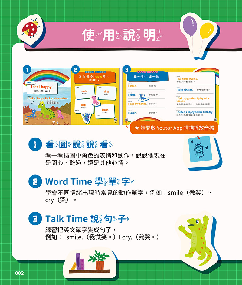 ◆利用書中蜥蜴角色的表情和動作,先引導孩子「指一指、說一說」:這是開心?還是難過?爸媽可以陪伴孩子聆聽音檔、跟讀句型,建立英語語感,也讓孩子認識不同情緒的名稱。例如:Happy(開心)、Sad(難過)。