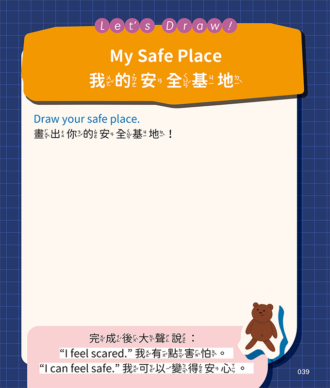 利用每個單元的互動塗鴉,練習用圖畫表達感受,在創作中理解情緒,也加深對英文句型的記憶。